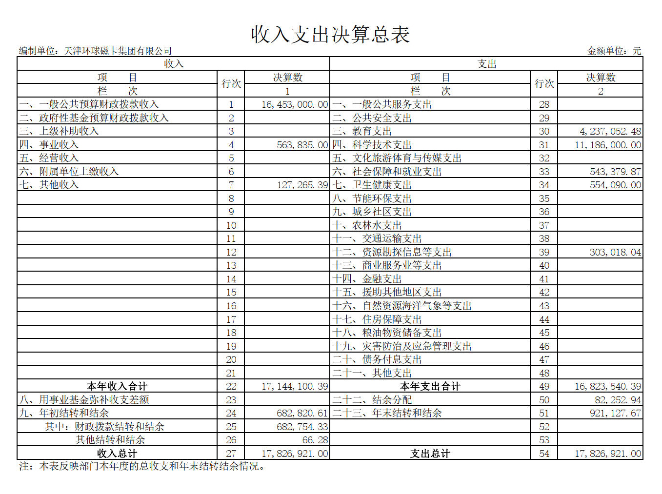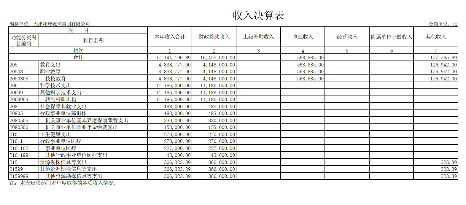 天津环球磁卡集团有限公司2019年度部门决算收入总计17,826,921.00元,与2018年决算相比减少2,004,924.04元,其中:财政拨款收入16,453,000.00元,占92.29%;事业收入563,835.00元,占3.16%;其他收入127,265.39元,占0.71%。