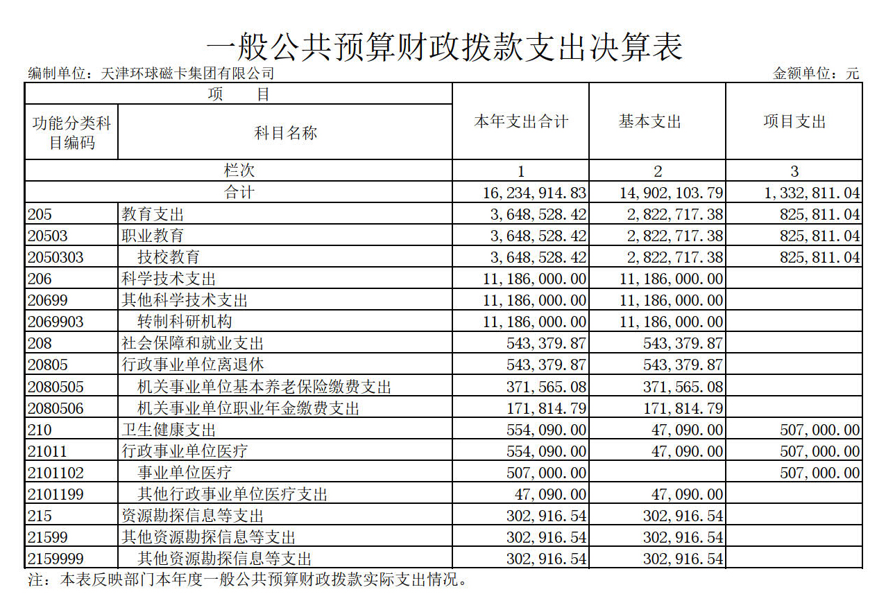 天津环球磁卡集团有限公司2019年度部门决算一般公共预算财政拨款支出总计16,234,914.83元,与2018年决算相比减少1,513,237.66元,具体情况如下:
