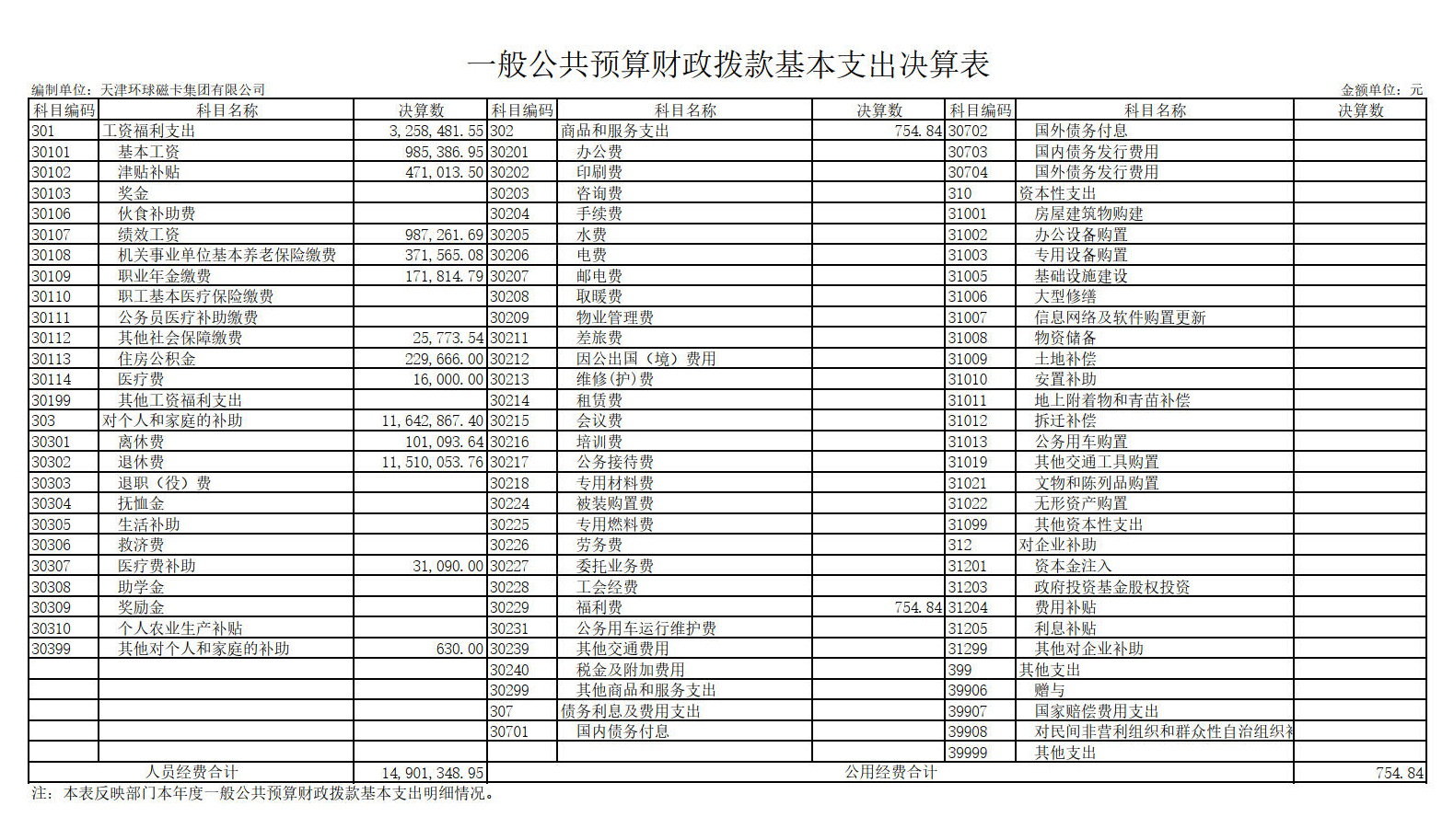 天津环球磁卡集团有限公司2019年度部门决算一般公共预算财政拨款基本支出总计14,902,103.79元,与2018年决算相比增加379,901.30元,具体情况如下: