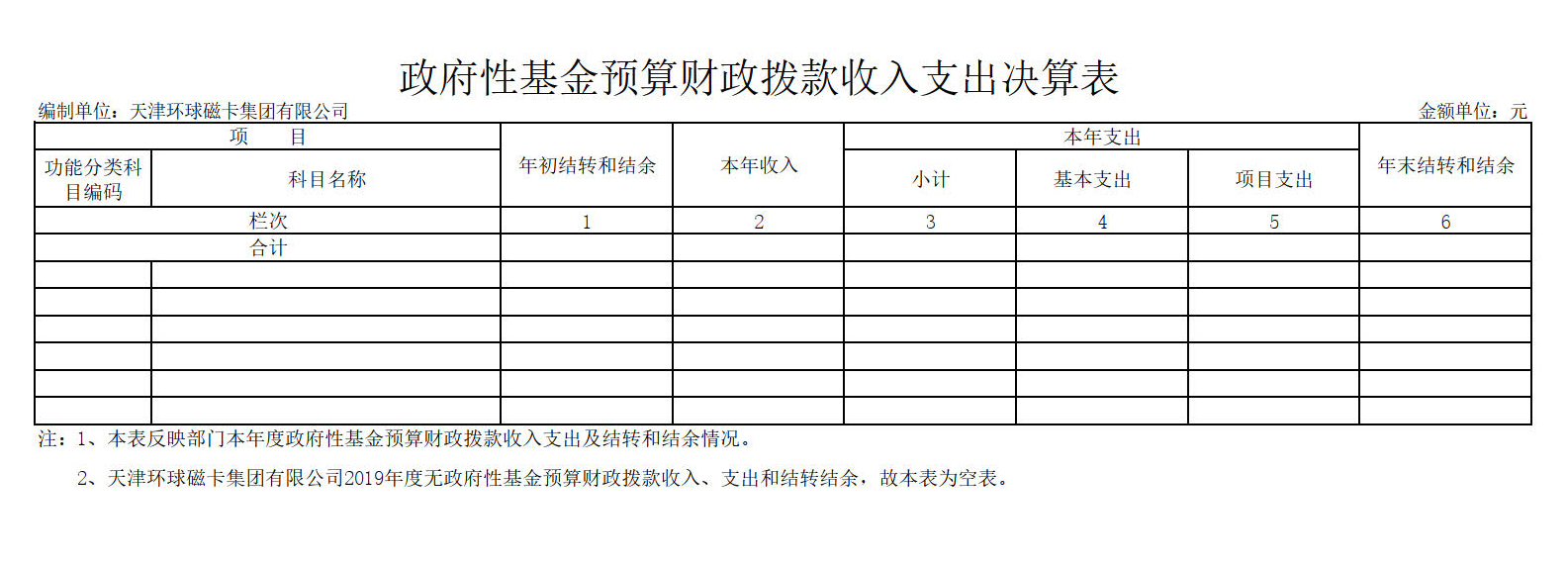 天津环球磁卡集团有限公司2019年度无政府性基金预算财政拨款收入、支出和结转结余。