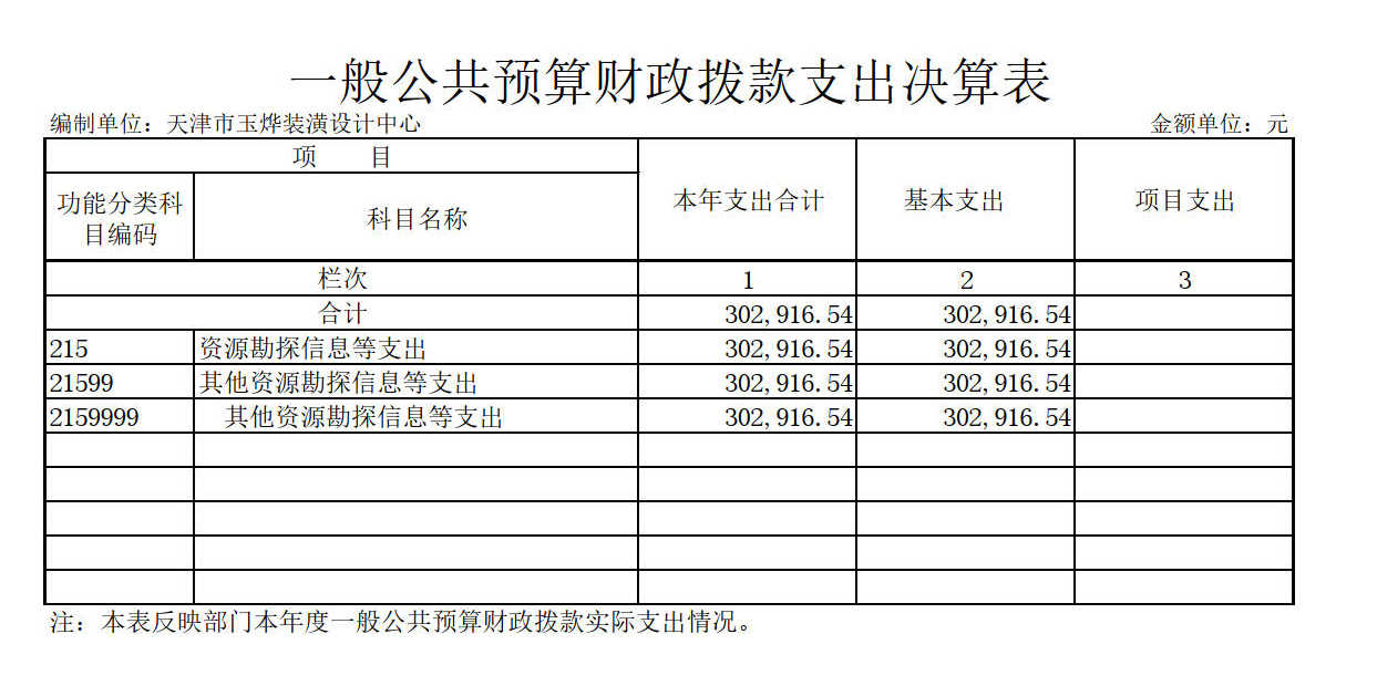 天津市玉烨装潢设计中心2019年度部门决算一般公共预算财政拨款支出总计302,916.54元,与2018年决算相比减少37,515.54元,具体情况如下: