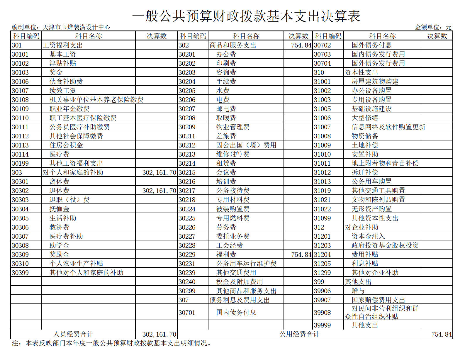 天津市玉烨装潢设计中心2019年度部门决算一般公共预算财政拨款基本支出总计302,916.54元,与2018年决算相比减少37,515.54元,具体情况如下: