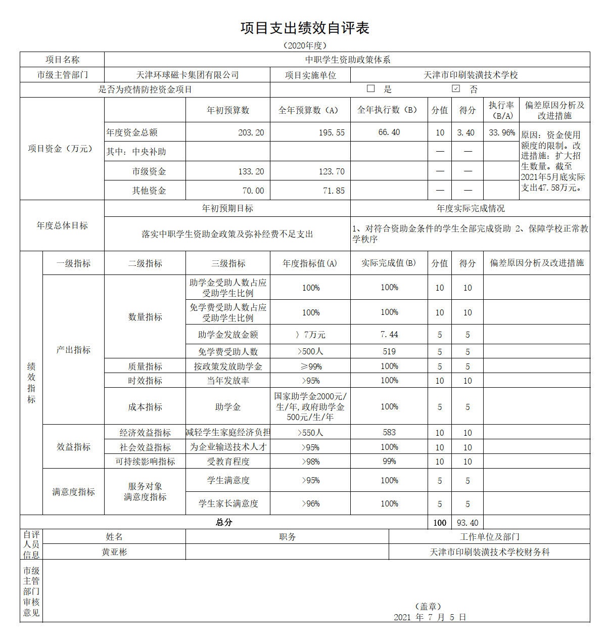 天津环球磁卡集团有限公司2020年度项目支出绩效自评表