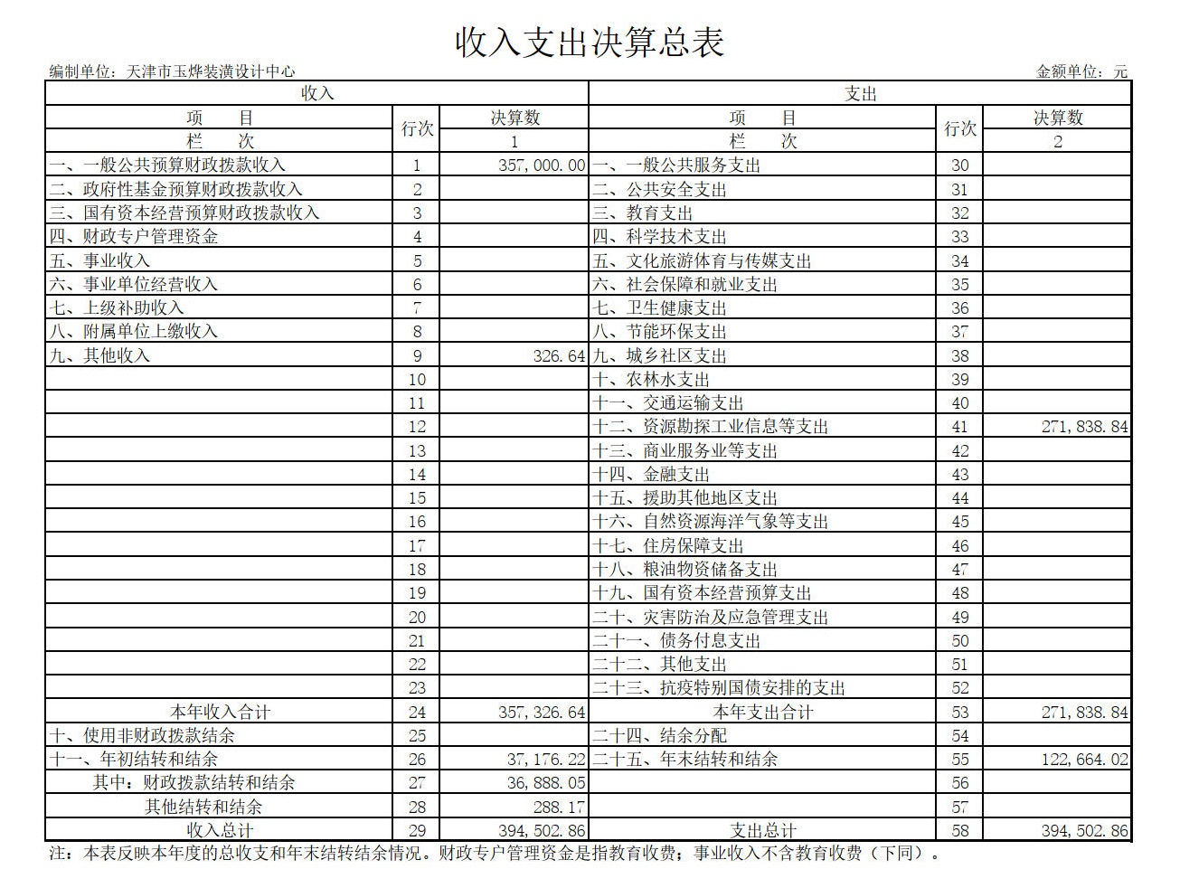 天津市玉烨装潢设计中心2020年度收入、支出决算总计394502.86元,与2019年决算相比增加 4979.23元,主要原因是财政拨款结转和结余增加。