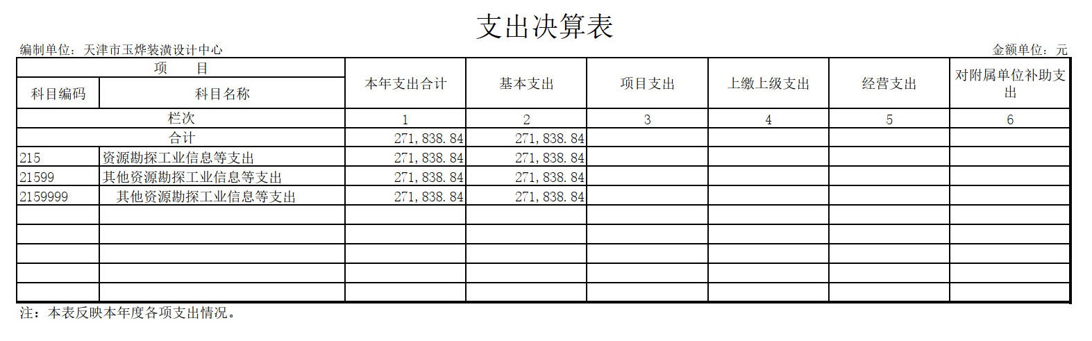 天津市玉烨装潢设计中心2020年度本年支出合计271838.84元,与2019年决算相比减少31179.20元,主要原因是退休人员减少。其中:基本支出271838.84元,占100%。