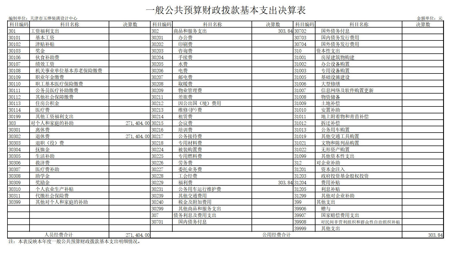 天津市玉烨装潢设计中心2020年度部门决算一般公共预算财政拨款基本支出合计271707.84元,与2019年决算相比减少31208.70元,主要原因是退休人员减少。具体情况如下: