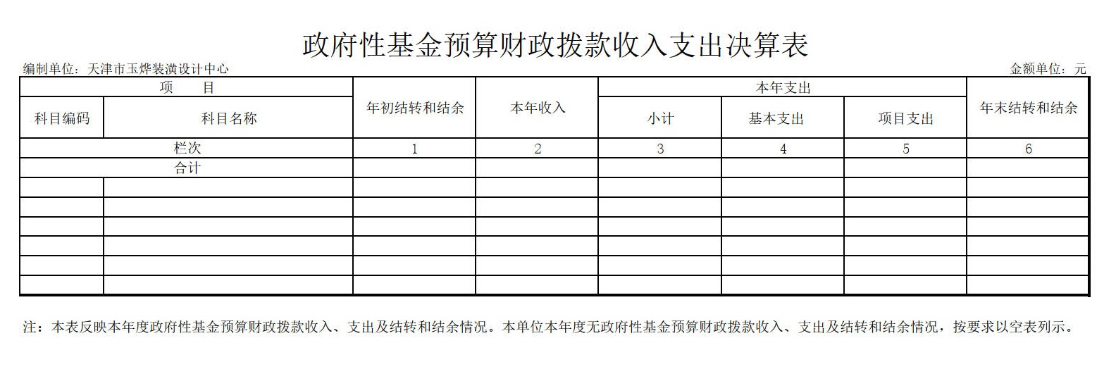2.天津市玉烨装潢设计中心2020年度政府性基金预算财政拨款收入支出决算表为空表。