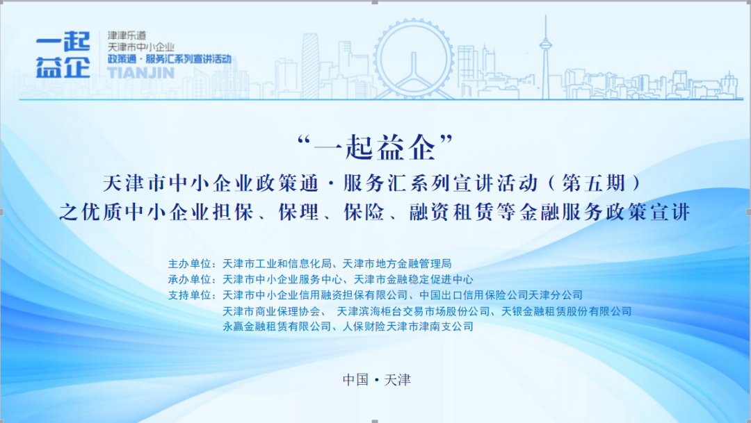 会上,天津市中小企业信用融资担保有限公司介绍了知识产权质押融资担保3.0版产品,形成“22321”5方分险模式,让更多资源协同助力知识产权融资发展;天津市商业保理协会从天津商业保理行业概况、商业保理业务模式及市场行业分析等方面进行了详细解读;天银金融租赁股份有限公司、永赢金融租赁有限公司两家融资租赁公司分别从融资租赁业务、专精特新专项服务及设备更新特色产品等方面进行了介绍;中国出口信用保险公司天津分公司从五个方面18条稳经济政策措施解读《贯彻落实推动外贸保稳提质助力扎实稳住经济的政策措施》,以政策“组合拳”助力稳外贸;人保财险天津市津南支公司用鲜活案例为企业解读经营保险服务方案;活动最后由天津滨海柜台交易市场股份公司就津心融平台做宣传推广,“津心融”平台是天津金融监管局以“政务服务+金融服务”为切入点打造,搭建政、金、企信息对接桥梁,助力金融机构挖掘政务数据价值,创新研发金融产品,为企业提供政策宣讲、融资对接、成长培育等“一站式”综合金融服务。会上,市中小企业服务中心还就天津市中小企业公共服务平台网络进行了宣传推介。