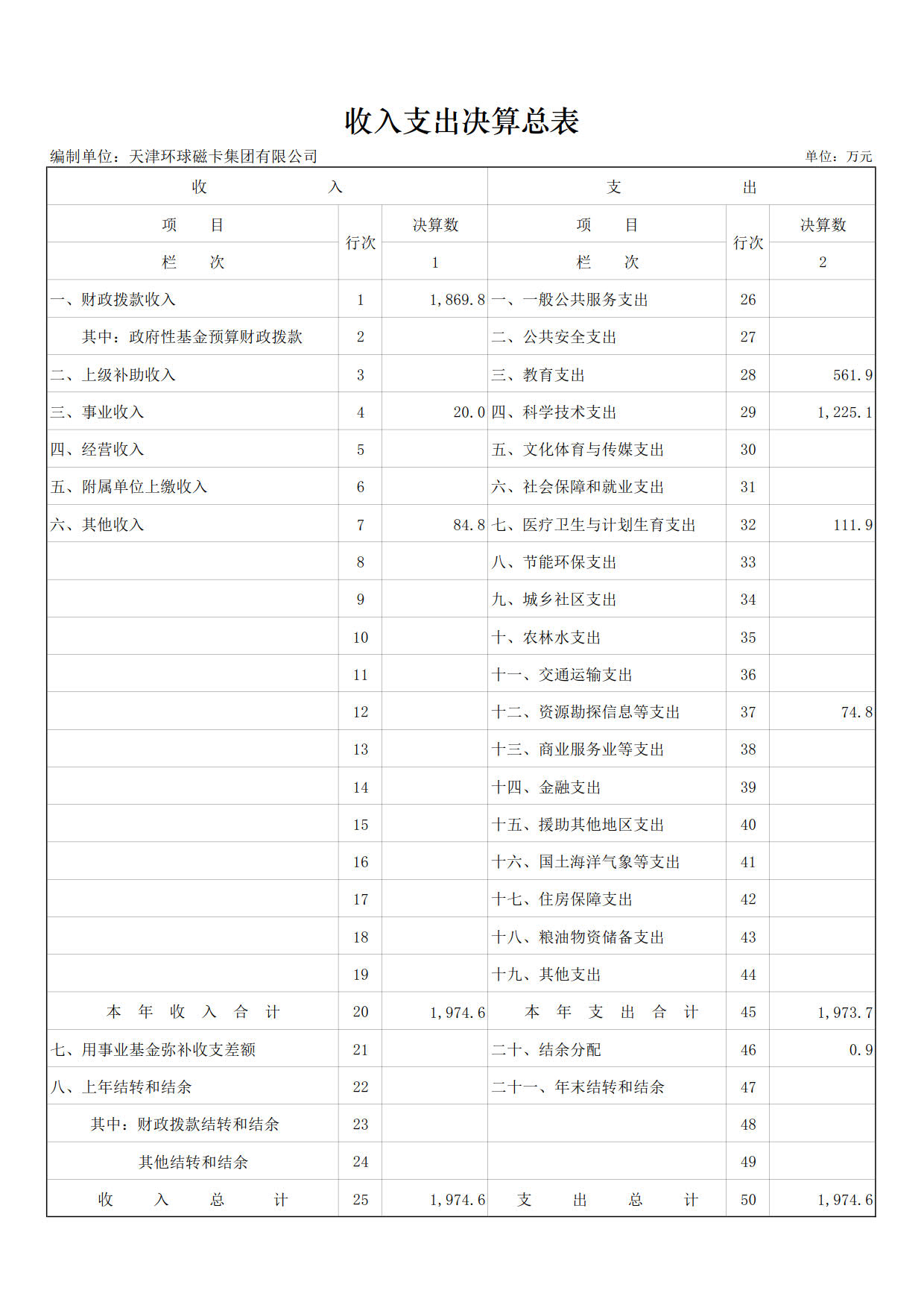 天津环球磁卡集团有限公司2016年度部门决算收入总计1974.6万元,与2015年决算相比增加537.3万元,其中:财政拨款收入1869.8万元,占94.7%;事业收入20.0万元,占1.0%;其他收入84.8万元,占4.3%。