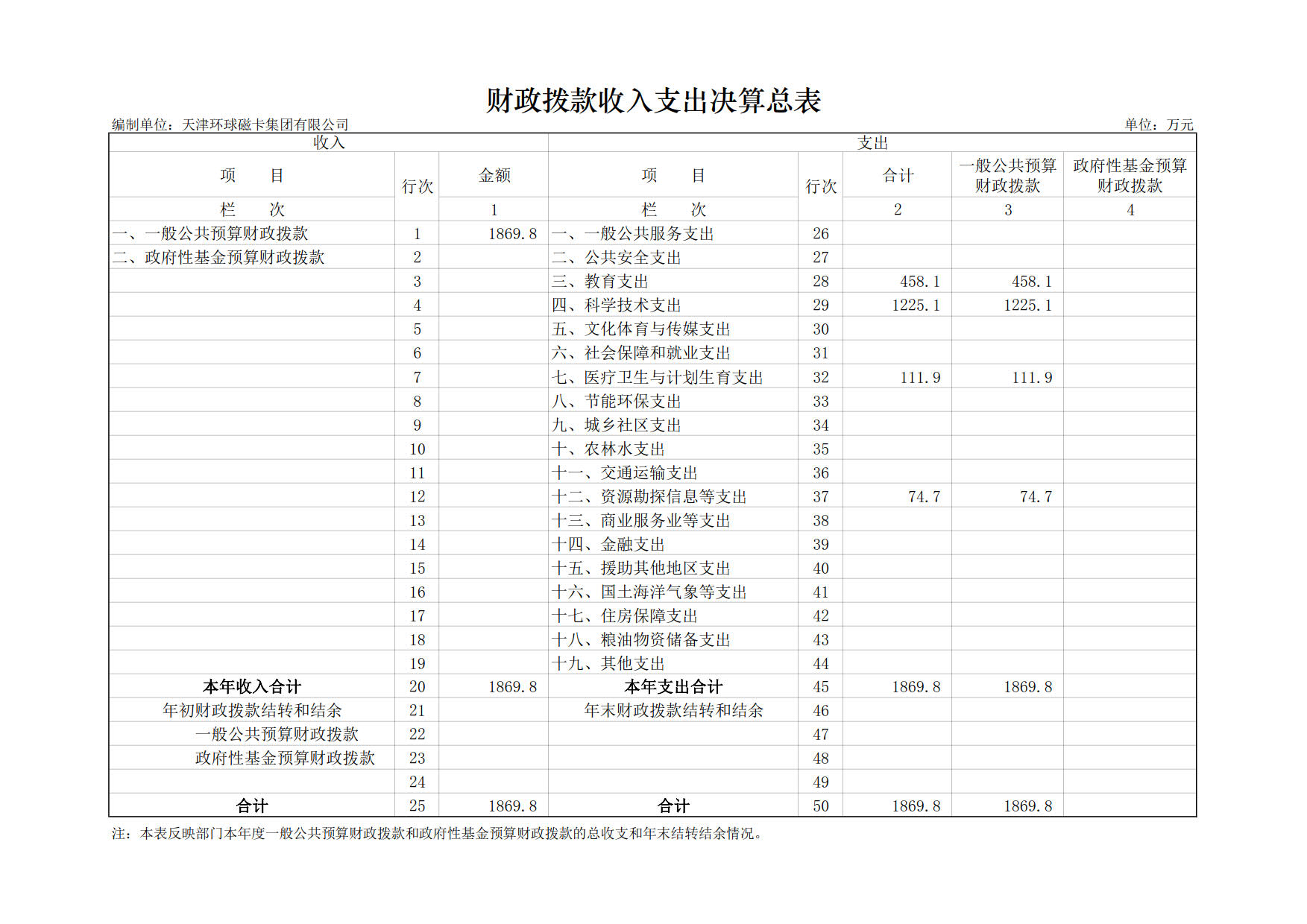 天津环球磁卡集团有限公司2016年度部门决算一般公共预算财政拨款支出总计1869.8万元,比上年增加476.7万元,具体情况如下: