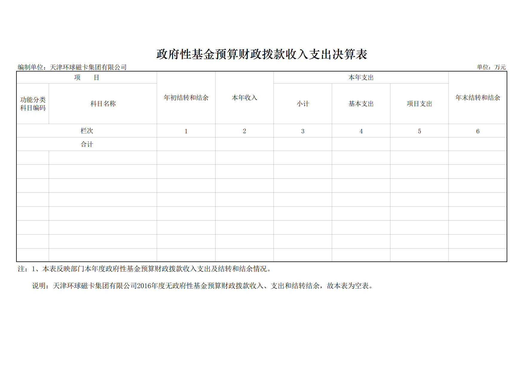 天津环球磁卡集团有限公司2016年度无政府性基金预算财政拨款收入、支出和结转结余。