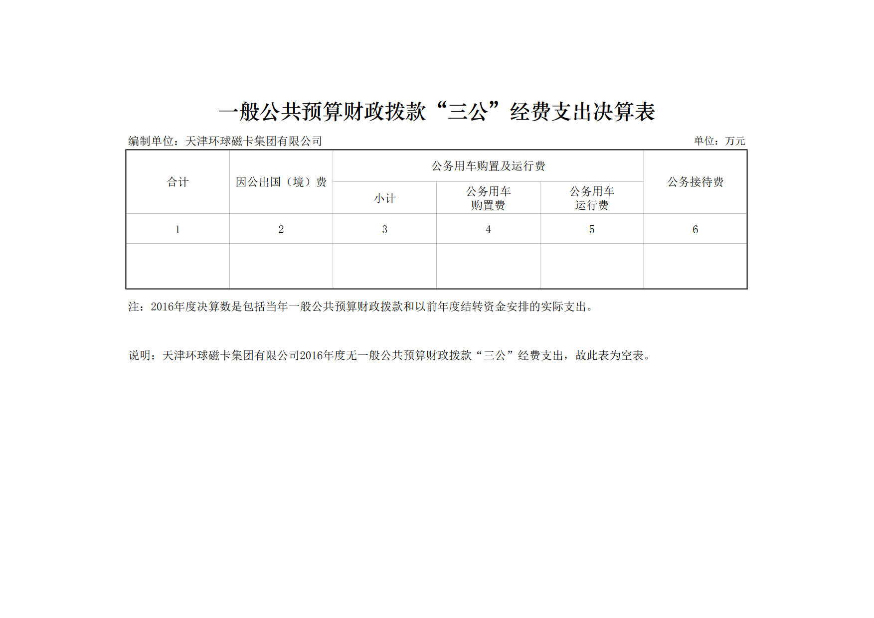 天津环球磁卡集团有限公司2016年度无一般公共预算财政拨款“三公”经费支出。