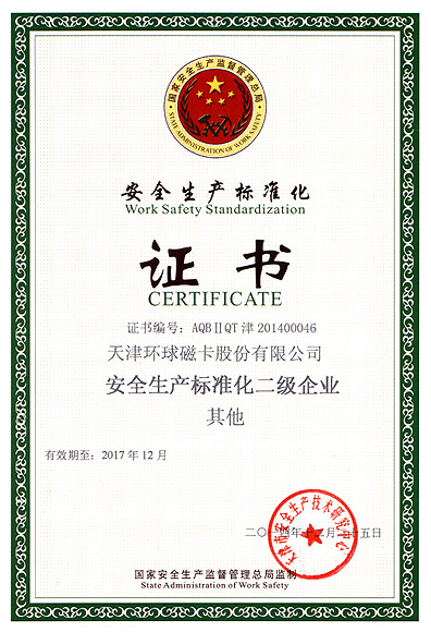 天津环球磁卡股份有限公司获安全生产标准化证书