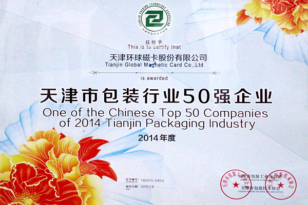 近日,由天津市包装工业办公室和天津市包装技术协会共同评选出的2014年度“天津市包装行业50强企业”名单出炉,天津环球磁卡股份有限公司位列其中。
