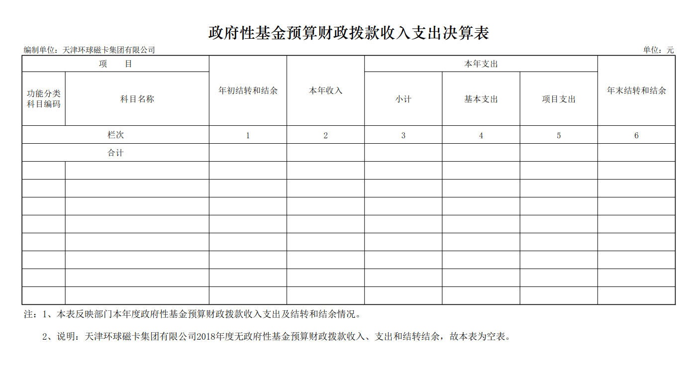 天津环球磁卡集团有限公司2018年度无政府性基金预算财政拨款收入、支出和结转结余。
