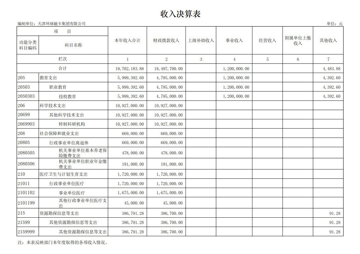 天津环球磁卡集团有限公司2018年度部门决算收入总计19831845.04元,与2017年决算相比减少2928507.97元,其中:财政拨款收入18497700.00元,占93.27%;事业收入1200000.00元,占6.05%;其他收入4483.88元,占0.02%。