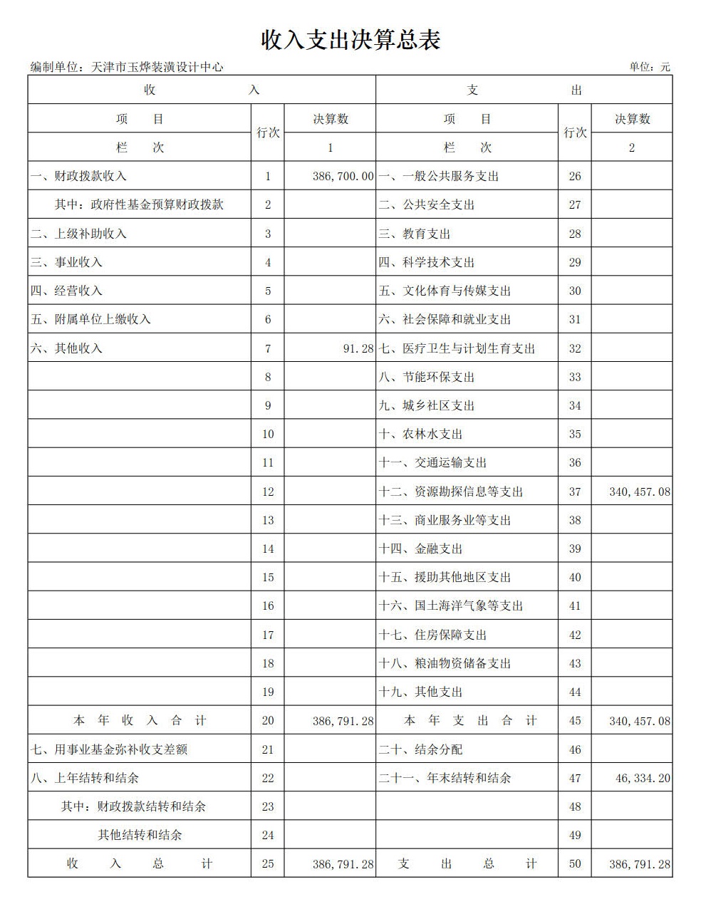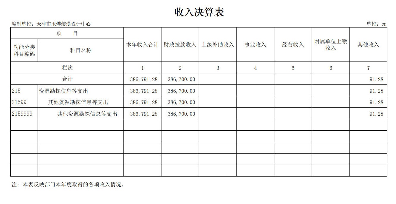 天津市玉烨装潢设计中心2018年度部门决算收入总计386791.28元,与2017年决算相比减少133847.61元,其中:财政拨款收入386700.00元,占99.98%;其他收入91.28元,占0.02% 。