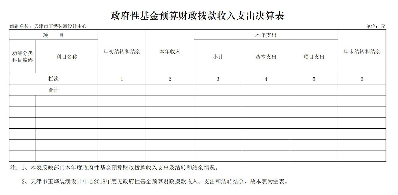 天津市玉烨装潢设计中心2018年度无政府性基金预算财政拨款收入、支出和结转结余。
